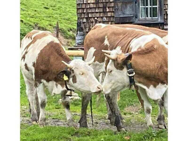 (links im Bild) wurde am 29.3.23 geboren und war recht kleinwüchsig und rangniedrig, was im Herdenverbund nicht die beste Position ist. Trotzdem wusste sie mit ihrer charmanten Art, wie man beim Almpersonal an Streicheleinheiten und Leckerlis kommt. All das sind Überlegungen, die in unsere Entscheidung fließt, welches Tier uns verlässt, was nie einfach ist. Die Gewissheit, dass Erika ein gutes Leben auf unserem Hof und Alm hatte, das wir bis zum Schluss stressarm begleiten können, macht es für uns leichter.